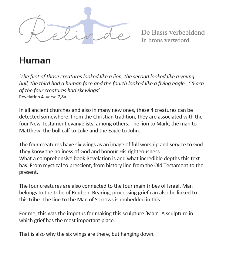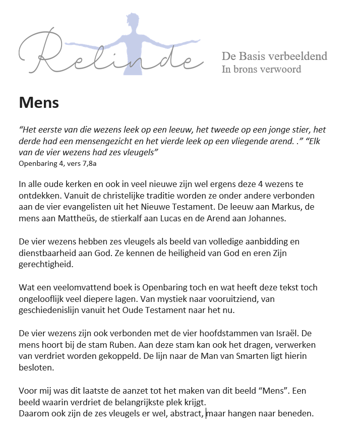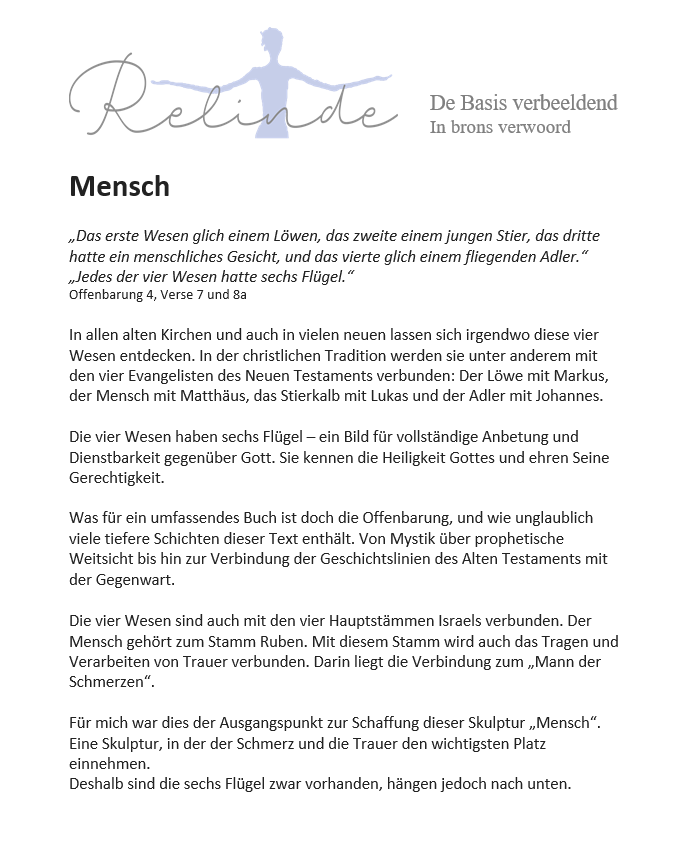Mens Uitleg Deutsch English Mens “Het eerste van die wezens leek op een leeuw, het tweede op een jonge stier, het derde had een mensengezicht en het vierde leek op een vliegende arend. .” “Elk van de vier wezens had zes vleugels” Openbaring 4, vers 7, 8a Prijs: Op aanvraag Brons. 175 cm Terug naar Galerij